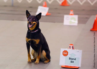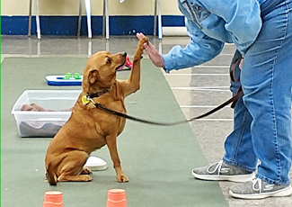 Casey readily offers her hi-fives as one of her tricks toward her Novice Trick Dog title.